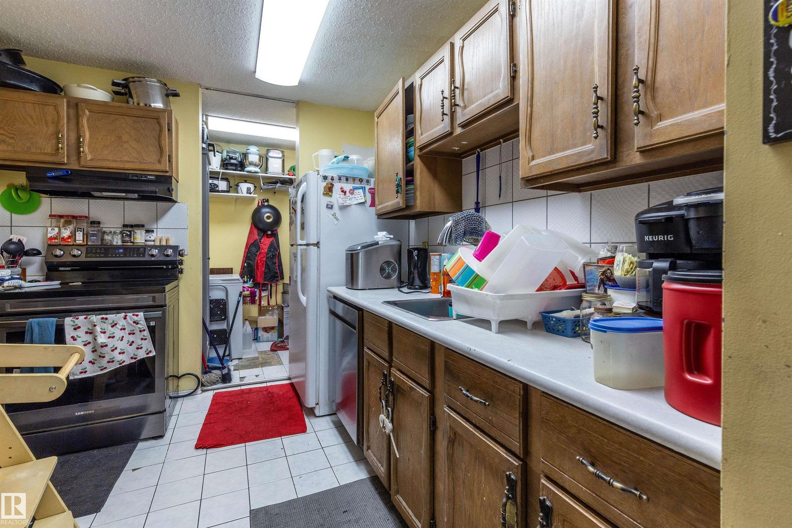 Welcome to the highly desirable Surrey Gardens! This MASSIVE end unit is complete with 2 bedrooms, 1 bath and a big FLEX room making it one of the largest units in the complex. Entering the property from the giant front BALCONY, immediately you will notice the WOOD BURNING fireplace - a rare find! The spacious living room and formal dining area lead into the kitchen with HUGE walk in pantry. 2 spacious bedrooms, phenomenal WALK IN CLOSET, and ensuite LAUNDRY make this property perfect for first time buyers, investors, or those looking to downsize. Complete with central AC, new furnace (2025), and storage locker; this property is a RARE find full of immense potential!